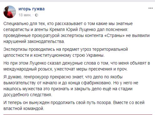"Специально для тех, кто рассказывает о том, какие мы знатные сепаратисты и агенты Кремля, Юрий Луценко дал пояснения: проведенные прокуратурой экспертизы контента "Страны" не выявили нарушений законодательства. Экспертизы проводились на предмет угроз территориальной целостности и конституционному строю Украины", – написал он в Facebook.