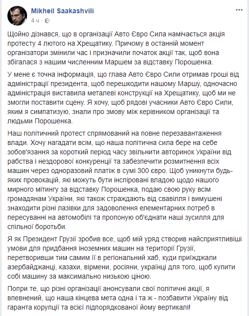 "В последний момент организаторы изменили время и назначили начало акции так, чтобы она совпадала с нашим многочисленным маршем за отставку Порошенко. У меня есть точная информация, что глава "Авто Евро Силы" получил деньги от администрации президента, для того чтобы помешать нашему маршу, одновременно администрация выставила железные конструкции на Крещатике, чтобы мы не смогли поставить сцену", - заявляет Саакашвили.