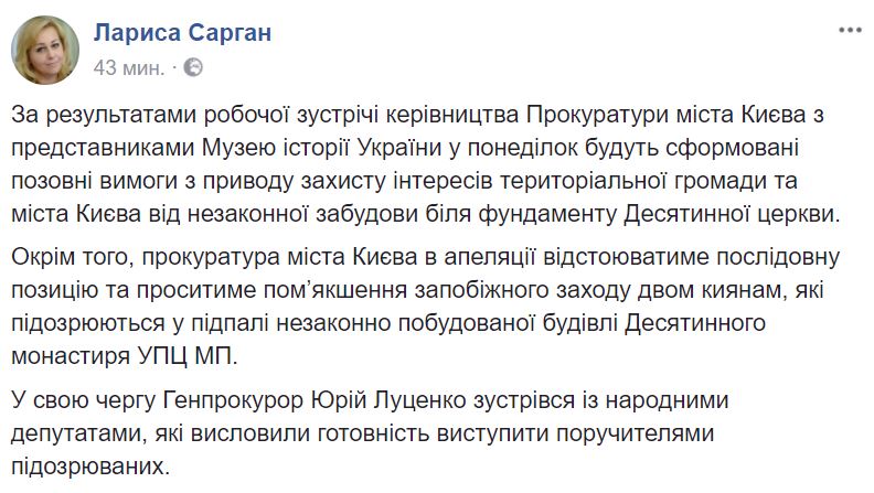 "Прокуратура города Киева будет в апелляции отстаивать последовательную позицию и будет просить смягчения меры пресечения двум киевлянам, которые подозреваются в поджоге незаконно построенного здания Десятинного монастыря УПЦ МП", - написала она.
