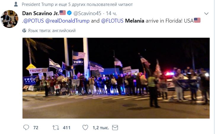 Из аэропорта президентский кортеж направился на восток по Южному бульвару к Мар-а-Лаго. Около 30 сторонников Трампа собрались перед торговым центром Publix, а другая группа из примерно 40 поклонников Трампа помахала знаками и флагами возле моста, который пересекает западный Палм-Бич.