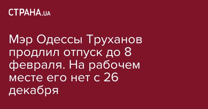 Ранее "Страна" разбиралась, кто и зачем воюет против мэра Одессы Труханова и почему его уже больше месяца нет в стране. Новогодний отдых мэра Южной Пальмиры начался 26 декабря, но 18 января, когда полагалось выйти на работу, отпуск был продлен еще на три дня.