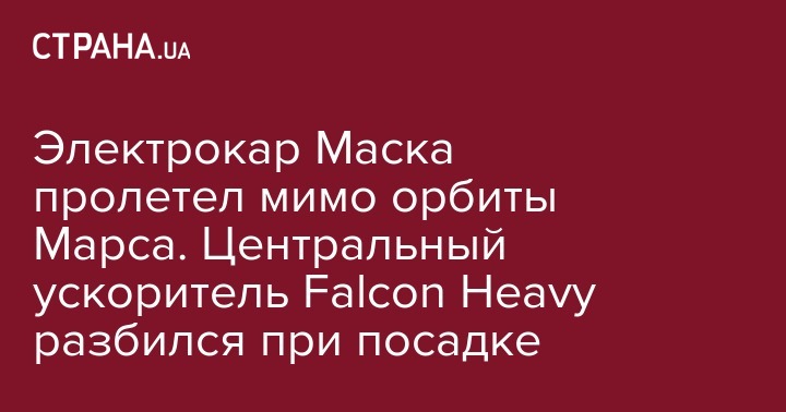 Электрокар Маска пролетел мимо орбиты Марса. Центральный ускоритель Falcon Heavy разбился при посадке