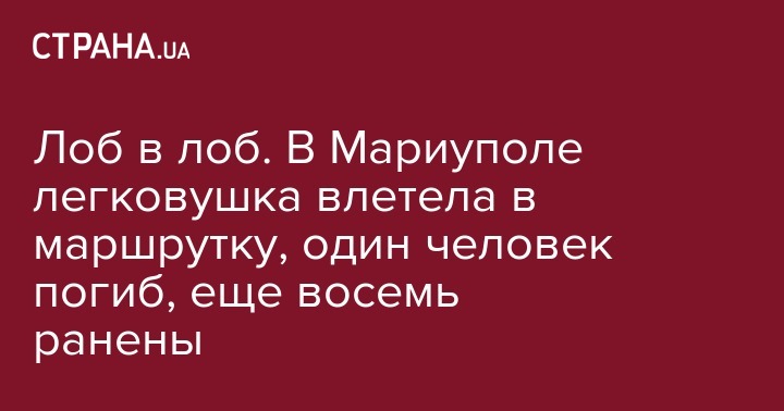 "Около 08.30 в Мариуполе произошло лобовое столкновение легкового автомобиля и маршрутного такси. По предварительной информации, в результате дорожно-транспортного происшествия пострадали 9 человек. В легковушке погиб пассажир, еще два человека травмированы. Также телесные повреждения получили 6 человек в маршрутке", - сообщили полиции.