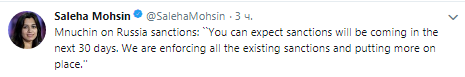 "Вы можете ожидать, что санкции последуют в течение следующих 30 дней. Мы исполняем все существующие санкции и вводим новые", - сказал Мнучин во время выступления в Калифорнийском университете в Лос-Анджелесе.