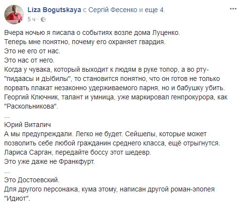 Когда у чувака, который выходит к людям, в руке топор, а во рту – "п***асы и дЫбилы", то становится понятно, что он готов не только порвать плакат незаконно удерживаемого парня, но и бабушку убить. Георгий Ключник, талант и умница, уже маркировал генпрокурора как "Раскольникова".