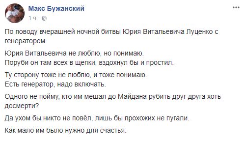 "По поводу вчерашней ночной битвы Юрия Витальевича Луценко с генератором. Юрия Витальевича не люблю, но понимаю. Поруби он там всех в щепки, вздохнул бы и простил.