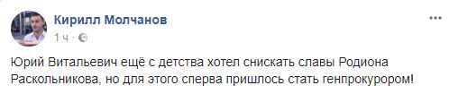 Политический эксперт Кирилл Молчанов шутит: "Юрий Витальевич ещё с детства хотел снискать славы Родиона Раскольникова, но для этого сперва пришлось стать генпрокурором!"