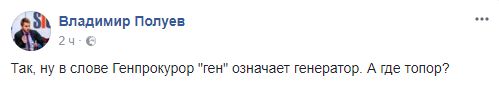 Ведущий Владимир Полуев: "Так, ну в слове Генпрокурор "ген" означает генератор. А где топор?"