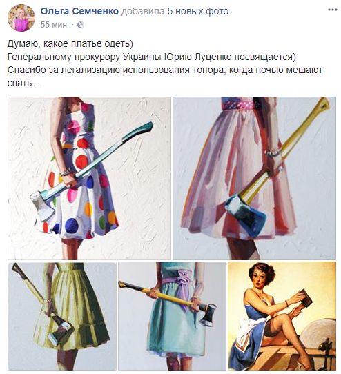 Глава медиахолдинга "Вести" Ольга Семченко: "Думаю, какое платье одеть) Генеральному прокурору Украины Юрию Луценко посвящается) Спасибо за легализацию использования топора, когда ночью мешают спать..."