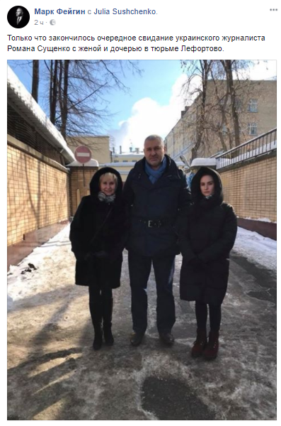 "Только что закончилось очередное свидание украинского журналиста Романа Сущенко с женой и дочерью в тюрьме Лефортово", - написал Фейгин.