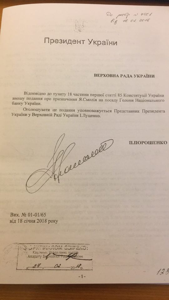 "В соответствии с п.18 ч.1 ст.85 Конституции Украины вношу представление о назначении Я.Смолия на должность главы Национального банка Украины (НБУ - Прим.Ред.)