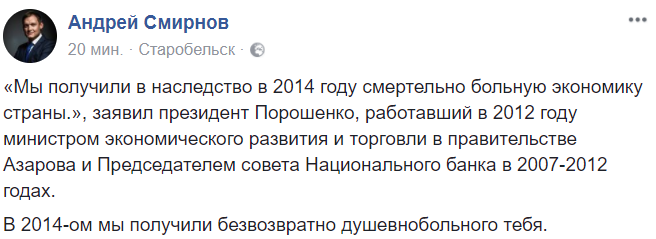 "Мы получили в наследство в 2014 году смертельно больную экономику страны", заявил президент Порошенко, работавший в 2012 году министром экономического развития и торговли в правительстве Азарова и Председателем совета Национального банка в 2007-2012 годах.