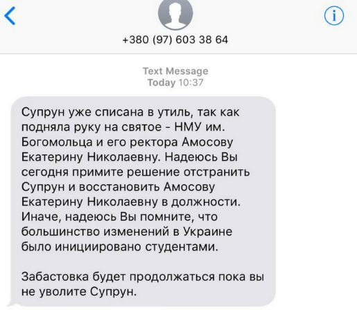 В скрине сообщения говорится, что забастовка в медуниверситета имени Богомольца будет продолжаться пока не уволят Ульяну Супрун и не восстановят временно отстраненного ректора Екатерину Амосову.