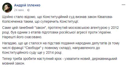 "Именно этот позорный "закон" был одним из этапов подготовки российской агрессии против Украины. Наконец он был отменен. Напомню, что это произошло на основании представления народных депутатов (в том числе фракции "Свободы" в полном составе), направленного в Конституционный суд еще в 2014 году", - написал Ильенко.