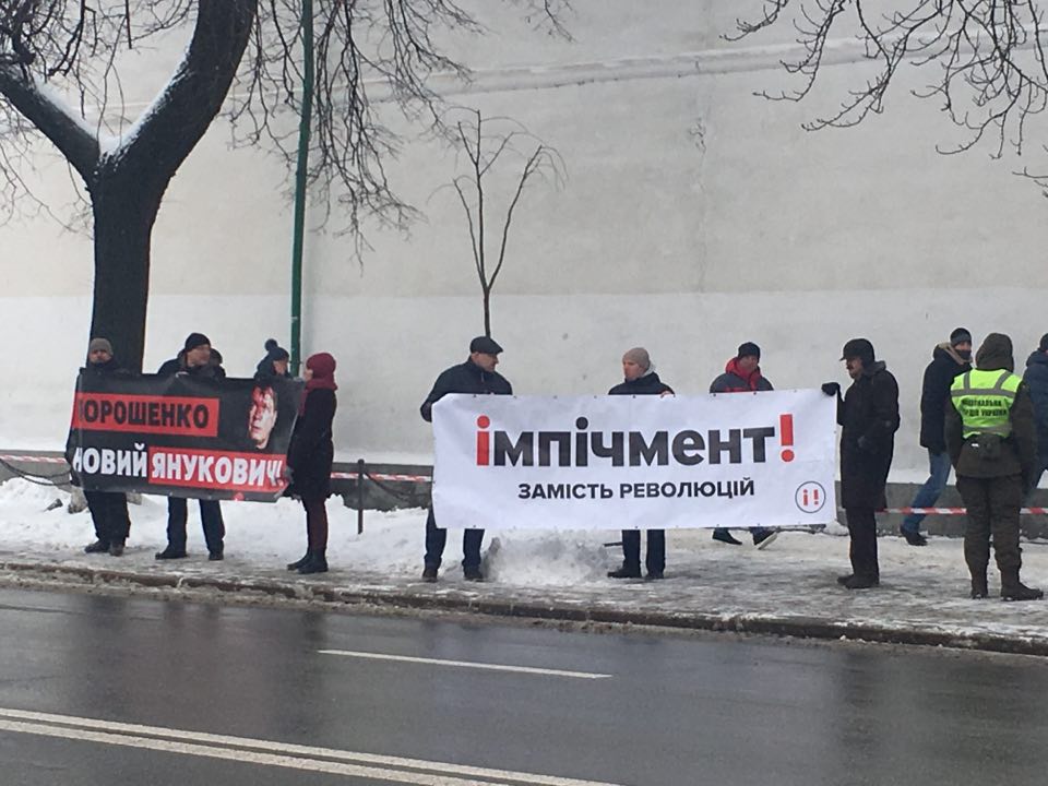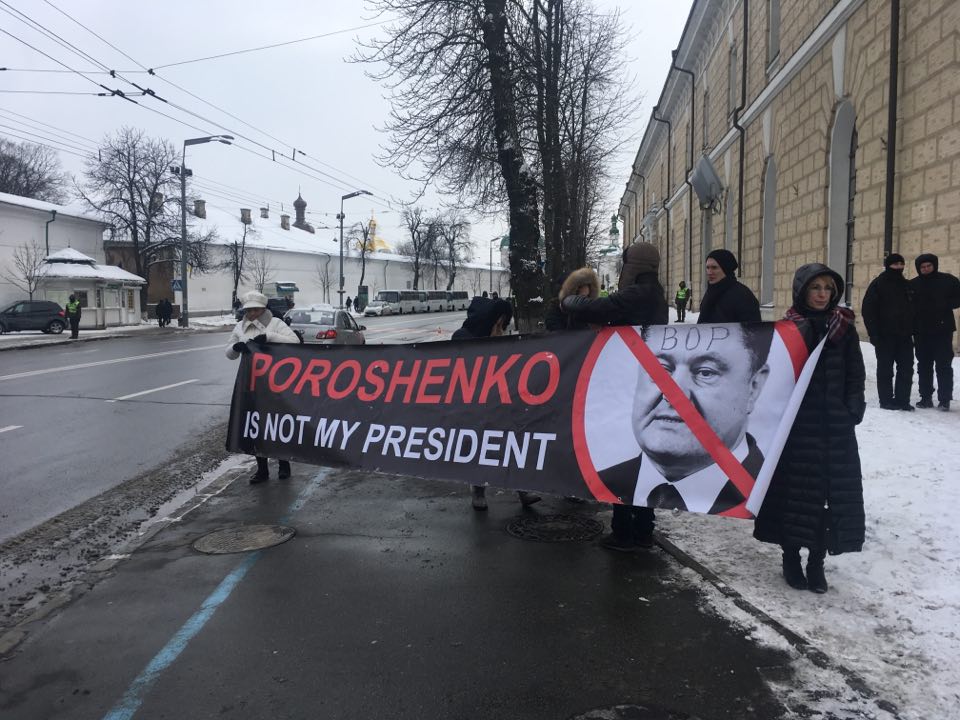 Помимо журналистов на улице Лаврской собрались люди с плакатами "Poroshenko is not my president", "Порошенко -вор", "Импичмент" и другими.