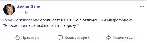 "Ирина Геращенко обращается к Ляшко с включенным микрофоном: "Я своего мужа люблю, а ты - корову" - написала Яхно.