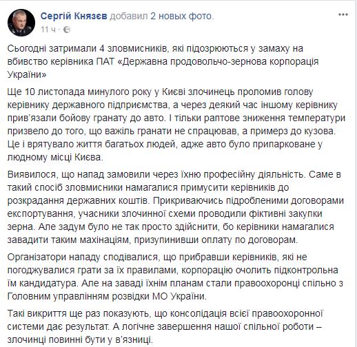 Полиция задержала четырех человек, которые подозреваются в покушении на убийство руководителя ПАО "Государственная продовольственно-зерновая корпорация Украины".