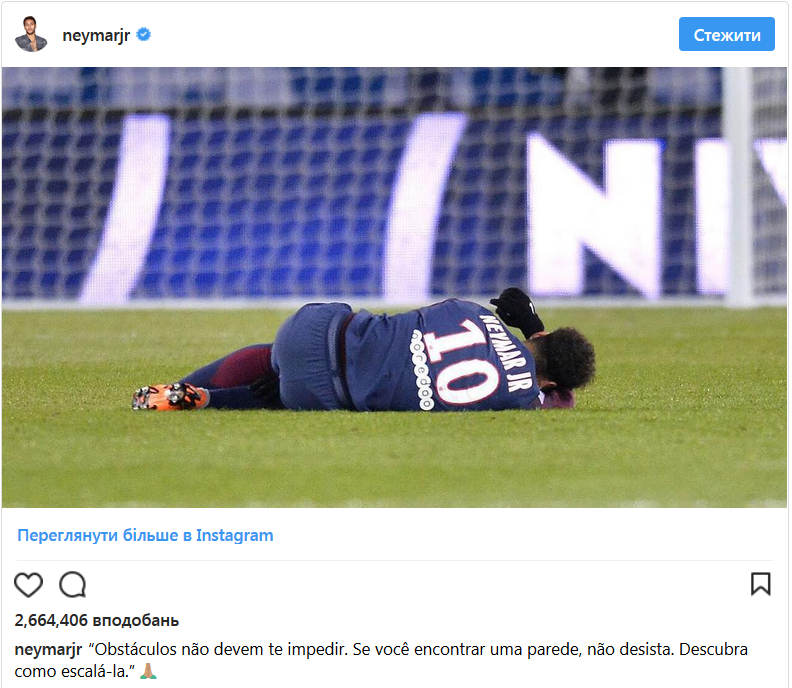 "Препятствия не должны останавливать. Если видите перед собой стену, не сдавайтесь. Узнайте, как перебраться через нее", - написал Неймар в своем Instagram.