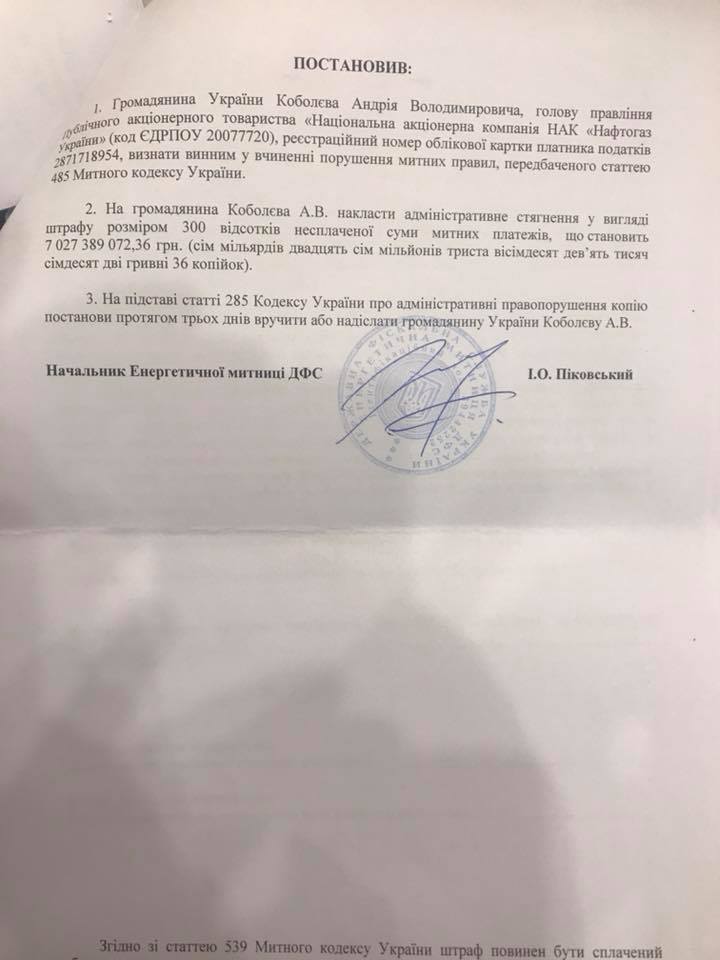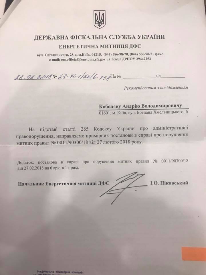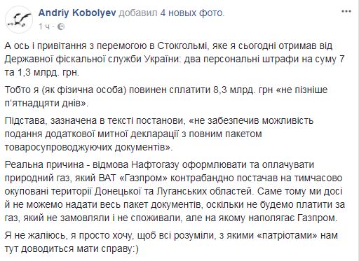 Глава правления "Нафтогаза" Андрей Коболев рассказал, что сегодня, 1 марта, получил от Государственной фискальной службы Украины два персональных штрафа на сумму 7 и 1,3 млрд грн.