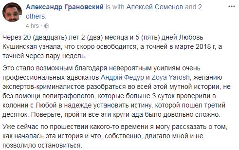 "Через 20 (двадцать) лет 2 (два) месяца и 5 (пять) дней Любовь Кушинская узнала, что скоро освободится, а точнее - в марте 2018 г, а точнее - через пару недель", - сообщил Грановский.