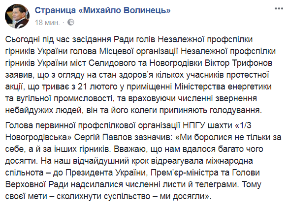Об этом в четверг на Facebook-странице сообщил глава Независимого профсоюза горняков Украины Михаил Волынец.