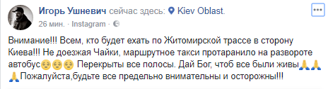 "Внимание!!! Всем, кто будет ехать по Житомирской трассе в сторону Киева!!! Не доезжая Чайки, маршрутное такси протаранило на развороте автобус. Перекрыты все полосы. Дай Бог, чтоб все были живы. Пожалуйста,будьте все предельно внимательны и осторожны!!", - написал он.