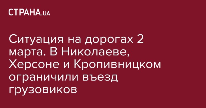 В пятницу, 2 марта, в течение суток по решению местных органов власти на период сложных погодных условий продолжается действие временных ограничений движение большегрузного транспорта в Кропивницком, Николаеве, Херсоне.