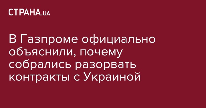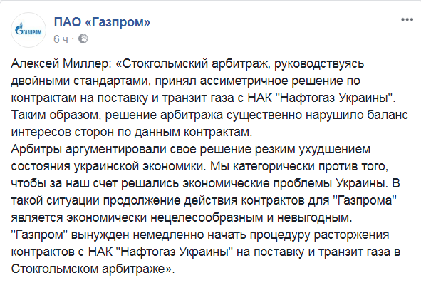 "Газпром" вынужден немедленно начать процедуру расторжения контрактов с НАК "Нафтогаз Украины" на поставку и транзит газа в Стокгольмском арбитраже", - говорится в сообщении российской компании.