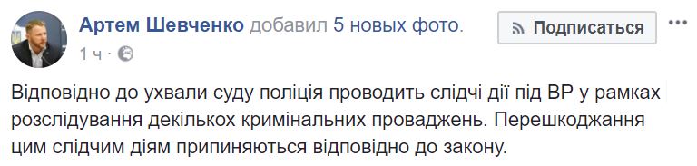 "В соответствии с постановлением суда полиция проводит следственные действия в ВР в рамках расследования нескольких уголовных производств. Препятствования этим следственным действиям прекращаются в соответствии с законом", - пишет Шевченко.