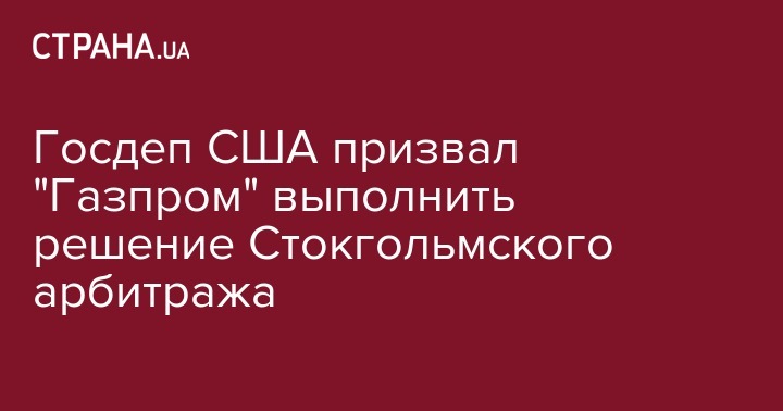 Госдепартамент США призвал "Газпром" выполнить решение Стокгольмского арбитража и возобновить поставки газа через Украину. Об этом заявила спикер Госдепа Хизер Науерт в своем Twitter.