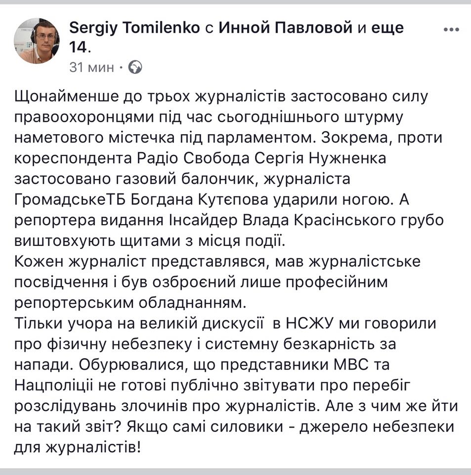 11:09 "Загадка из серии – "Угадай, какой год". В 2013-2014 страна бы стояла на ушах. Сейчас всем все пох", – пишет о разгоне МихоМайдана журналист Максим Войтенко.