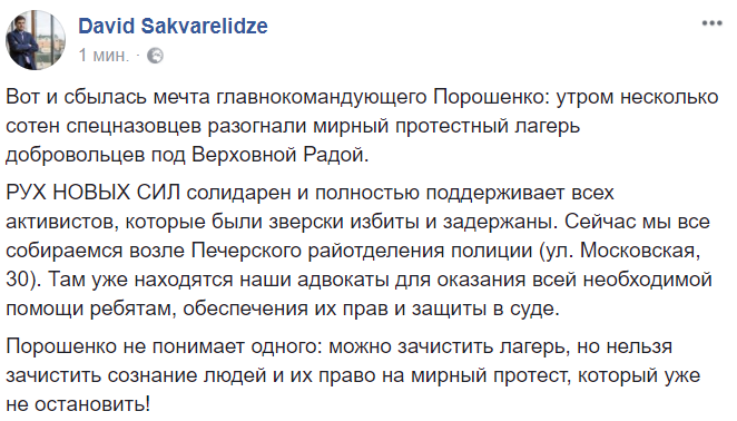 12:19 "Власть растоптала в крови мирных митингующих конституционное право на мирное собрание на площади Конституции", – написал в Facebook нардеп Юрий Деревянко.