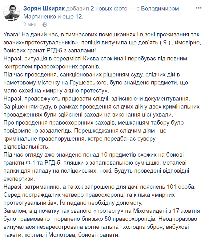 10:11 Советник Авакова Шкиряк в цветистых выражениях расписал происходящее на МихоМайдане. Найдено оружие (10 гранат), ранены полицейские. Говорит, что "задержана и приглашена для дачи пояснений 101 персона".
