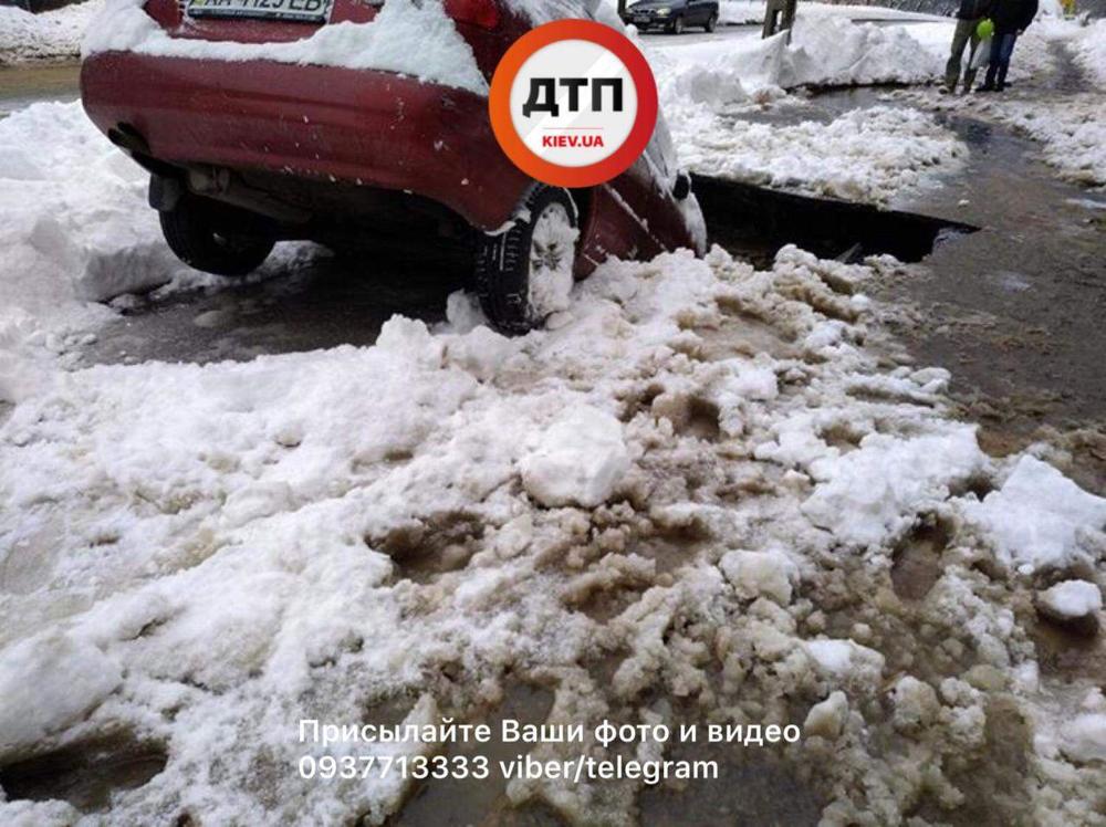 В субботу, 3 марта, в Шевченковском районе Киева, где произошел масштабный прорыв трубопровода, автомобиль марки Daewoo Lanos наполовину провалился под землю.