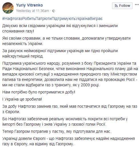 "За сутки "Нафтогаз" заменил газ, который должен поставляться от "Газпрома" на газ из Европы", - написал Витренко в Facebook.