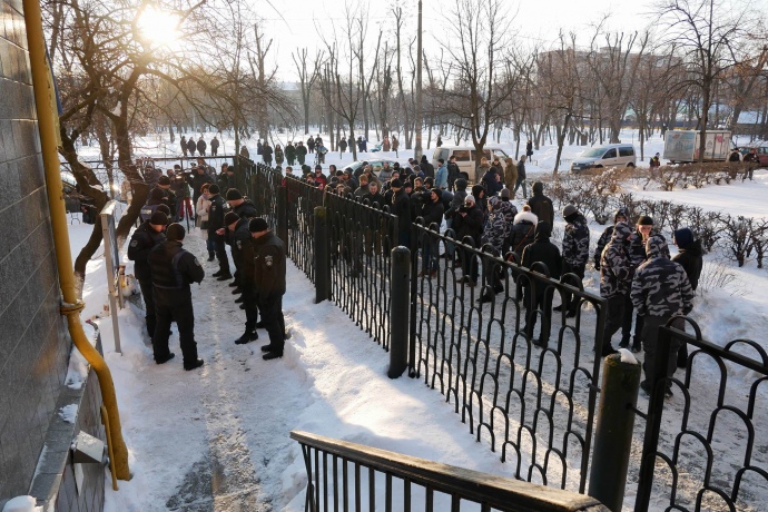 Он рассказал, что у суда представители националистической организации С14 проверяют всех подозрительных лиц - просят достать телефоны и показать последние звонки и сообщения.