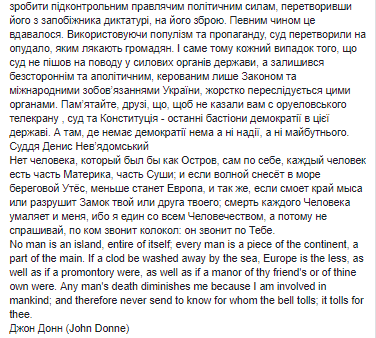 "Есть одно "но"... Обвиняемым в деле является лицо, которому предъявлено обвинение по политическому делу. К тому же, которое имеет оппозиционные взгляды. Не считаю этичным обсуждать взгляды этого человека, поскольку на самом деле для этой ситуации это не имеет никакого значения", - написал судья.