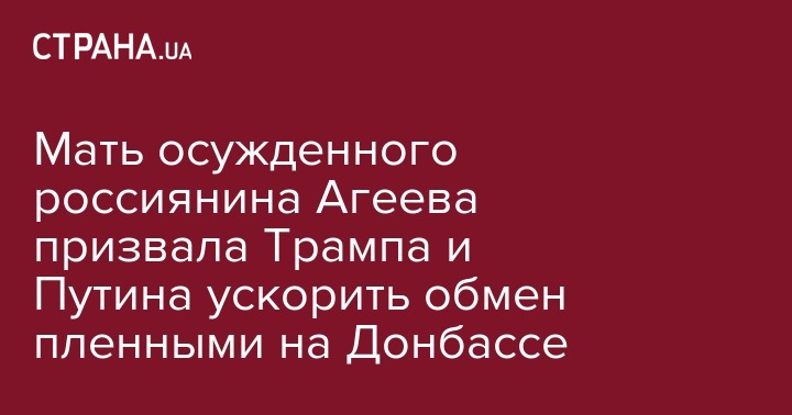 Мать приговоренного к 10 годам заключения за участие в торрористической организации на Донбассе россиянина Виктора Агеева обратилась к президенту США Дональду Трампу, главе РФ Владимиру Путину, а также к лидерам ЕС с призывом содействовать скорейшему обмену пленными между Москвой и Киевом.
