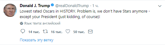 Президент США Дональд Трамп отметил, что рейтинг 90-й церемонии вручения премии "Оскар" "был самым низким в истории". Об этом он написал в своем Twitter.