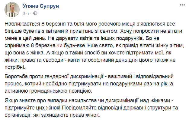 Свое обращение, приуроченное к 8 марта, Супрун опубликовала в Facebook.