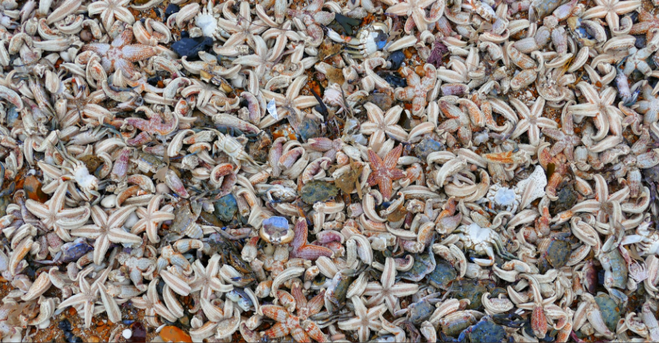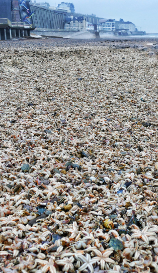 После мощного циклона, на побережье Великобритании, в графстве Йоркшир и Кент, выбросило тонны мертвых морских звезд.