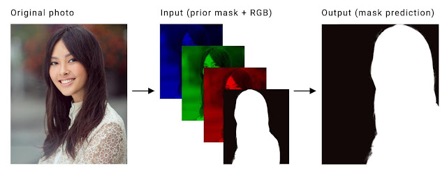 Исходный кадр (слева) разделен по трем цветным каналам и объединен с предыдущей маской (в середине). Это используется как вход в нашу нейронную сеть для прогнозирования маски для текущего кадра (справа). Фото: research.googleblog.com