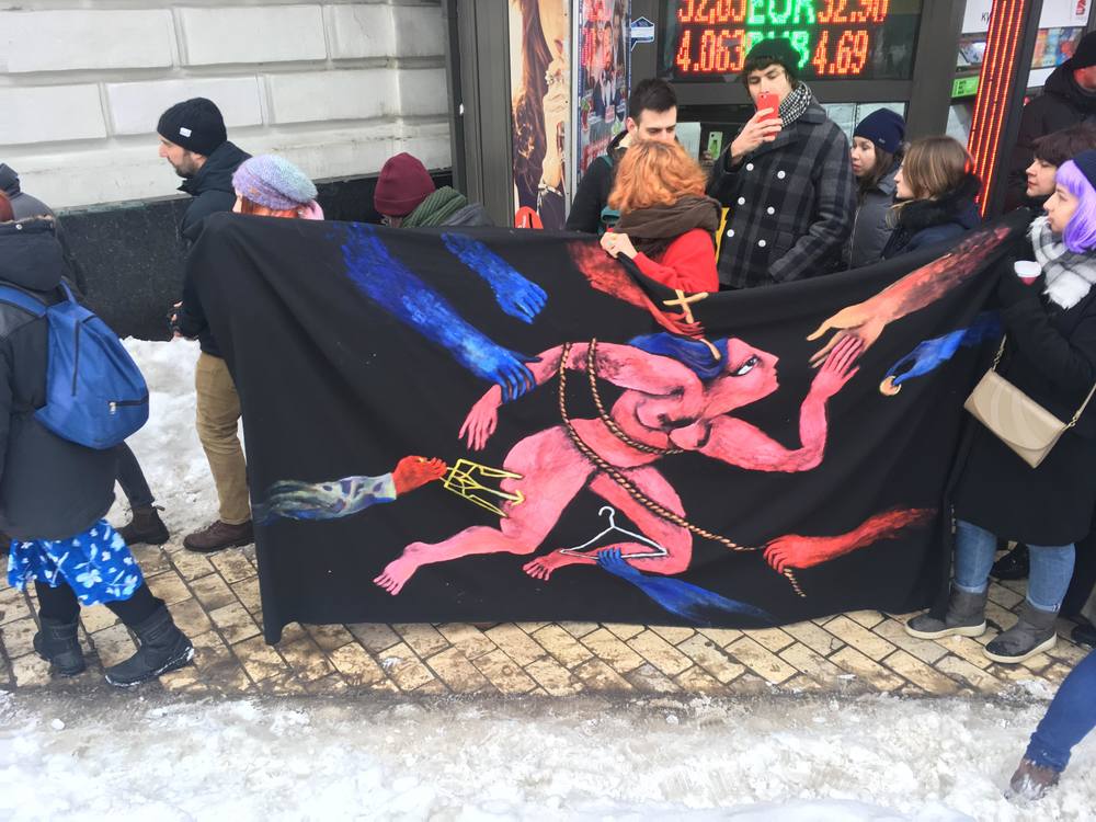 Националистов возмутил этот плакат. Они считают, что это изображение порочит национальные символы.