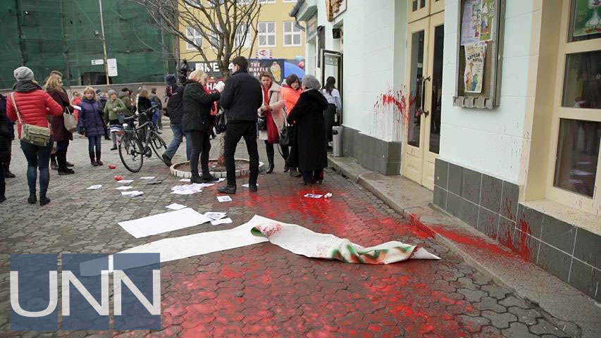 Девушек с плакатами облили красной краской, несмотря на то, что акция была анонсирована.