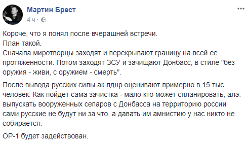 "Короче, что я понял после вчерашней встречи. План такой. Сначала миротворцы заходят и перекрывают границу на всей ее протяженности. Потом заходят ЗСУ и зачищают Донбасс, в стиле "без оружия – живи, с оружием – смерть". После вывода русских силы АК "ЛДНР" оценивают примерно в 15 тысяч человек. Как пойдет сама зачистка – мало кто может спланировать, алэ: выпускать вооруженных сепаров с Донбасса на территорию России сами русские не будут ни за что, а давать им амнистию у нас никто не собирается. ОР-1 будет задействован", – написал блогер.