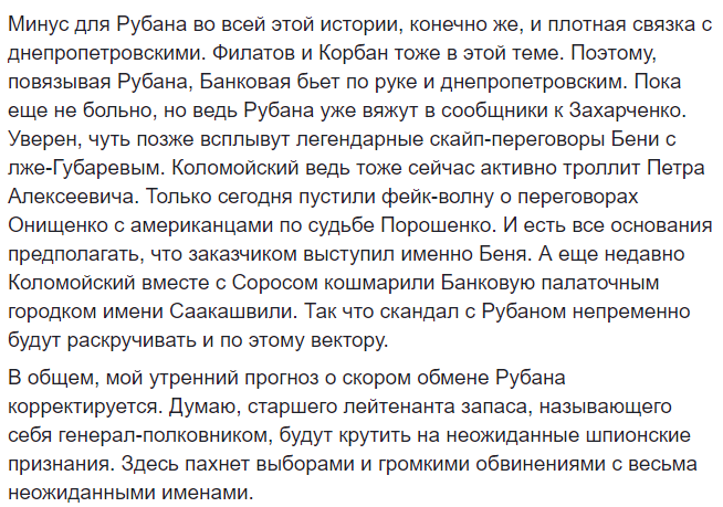 "... Хочу сказать про Рубана и Медведчука, о чем сразу все сейчас заговорили. Не знаю, что их связывало в 2013-2014-е, но в последние годы отношения между ними были тяжелыми, так как конкурировали они на одной теме – обмене пленных. Ну как конкурировали. С 2015 года этот процесс курирует Виктор Медведчук и Рубана полностью из него исключили. По этой причине Рубан неоднократно публично критиковал Медведчука. Попытка Рубана вместе с Савченко вклиниться в процесс в конце 2016 года, напрямую связавшись с сепаратистами, закончилась тем, что СБУ сначала задержала Рубана, а затем запретила ему въезд на неподконтрольные территории.