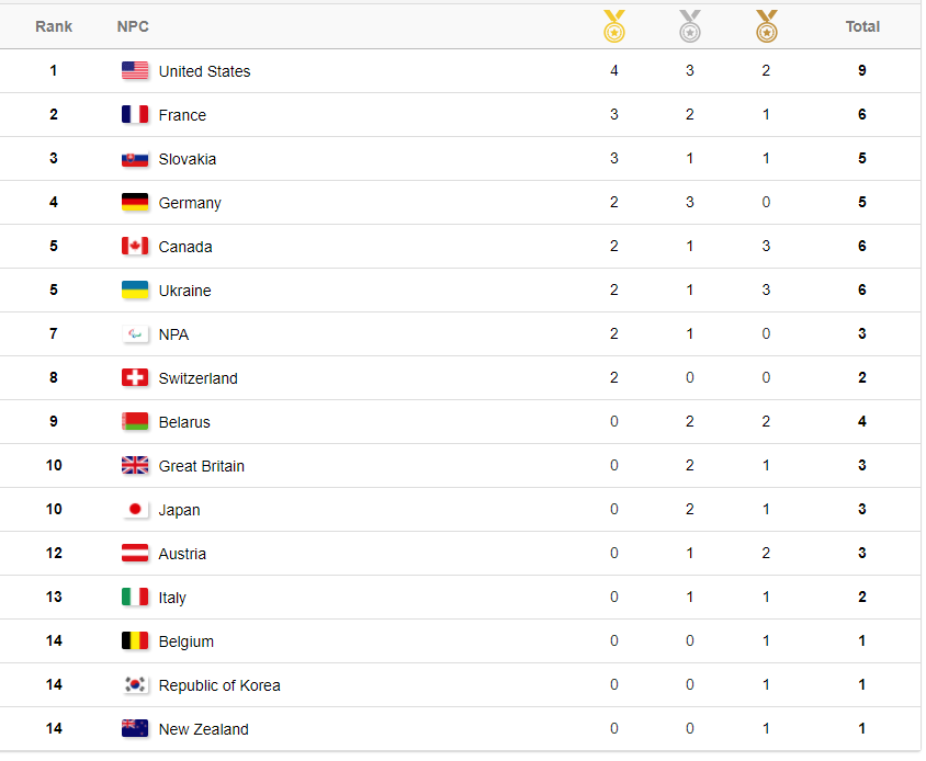Первое место все также у сборной США, которая взяла уже четыре "золота" и на втором месте - команда Франции с тремя золотыми наградами, а вот на третье вышла сборная Словакии - три золотых медали, одна серебряная и одна бронзовая. Следом идет сборная Германии: два "золота", три "серебра" и ни одной "бронзы".