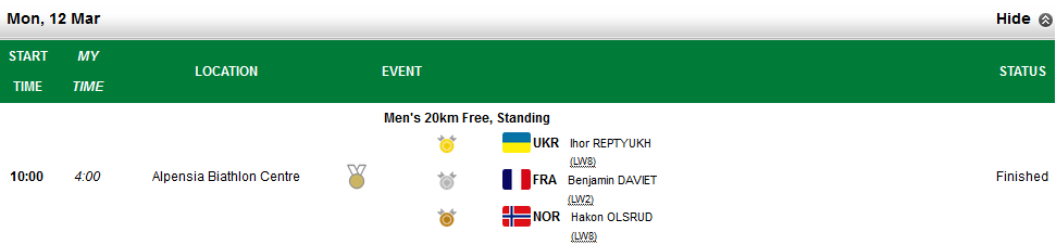 23-летний украинец Игорь Рептюх стал паралимпийским чемпионом в лыжной гонке на 20 км среди спортсменов с поражением опорно-двигательного аппарата и принес сборной Украины третью золотую медаль на XII Паралимпийских играх в Пхенчхане.