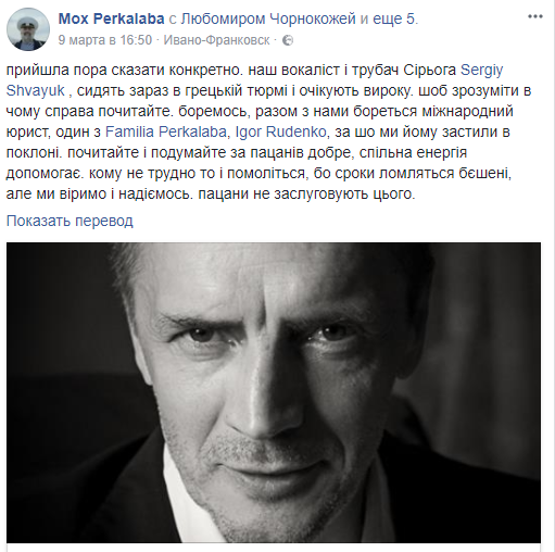 "Наш вокалист и трубач Серега сидит сейчас в греческой тюрьме, ожидают приговора. Боремся, вместе с нами и международный юрист Игорь Руденко, за что мы ему застыли в поклоне. Почитайте и подумайте о пацанах хорошо, общая энергия помогает. Кому не трудно, то и помолитесь, потому что сроки ломятся бешеные, но мы верим и надеемся. Пацаны не заслуживают этого", - написал в сети продюсер Familia Perkalaba Олег Мох Гнатов.