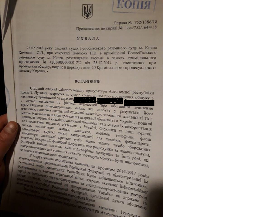 Судя по первой странице решения суда, обыск осуществляется в рамках уголовного производства об "информационной агрессии" против Украины со стороны "неустановленных представителей Российской Федерации и оккупационных властей Крыма". Расследованием дела занимается прокуратура Автономной республики Крым.